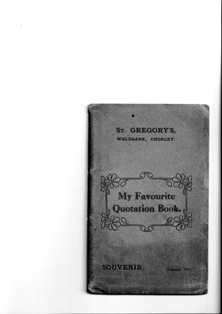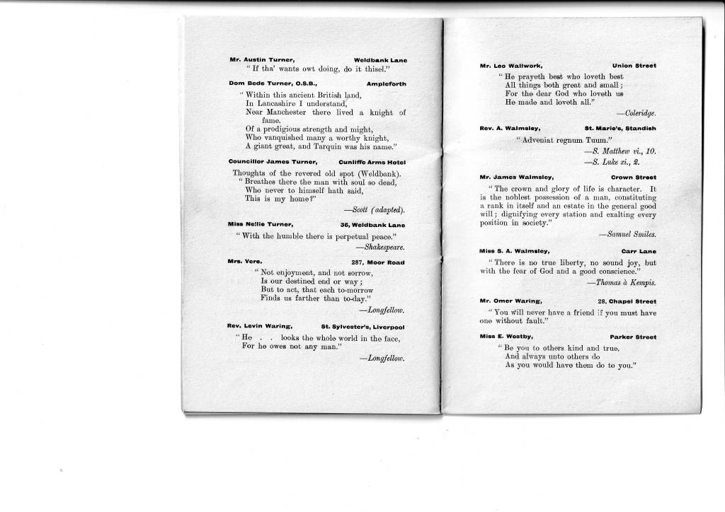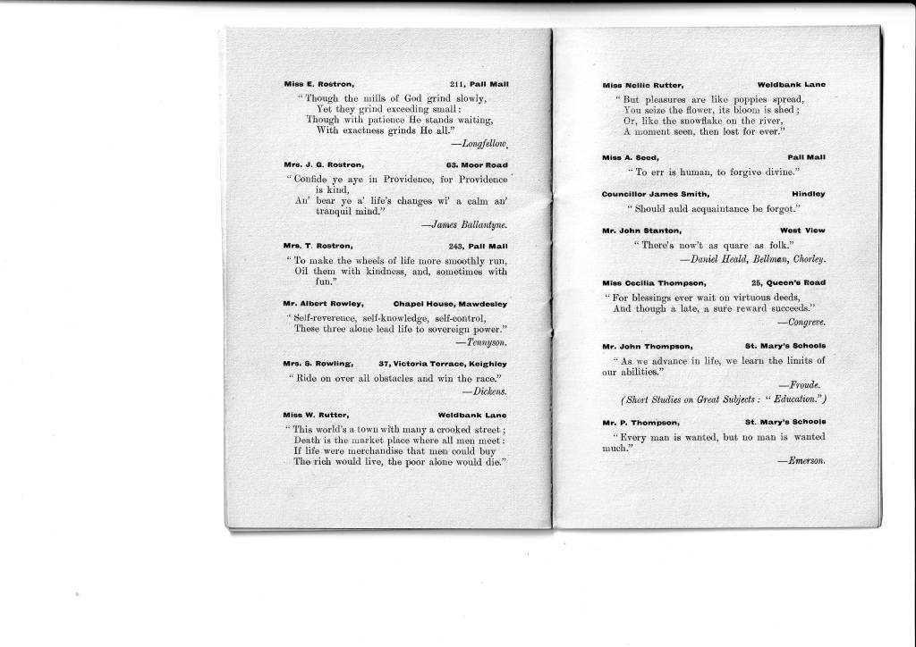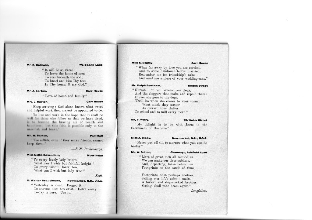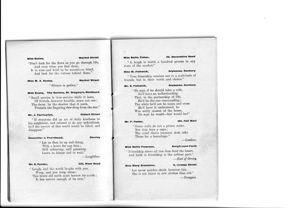 I think we all have a tendency to imagine that our ancestors, especially in a small town such as Chorley, would not have had much access to literature and perhaps we assume that their education was very limited. Certainly it was different from the education of today but literature was an important part of it. (I can recall an aunt of my mother’s, when in her 70s, reciting the entire ‘Rime of the Ancient Mariner’ which she had first learnt at school.) This little book indicates that the Weldbankers of old were indeed not the country yokels one might imagine. Their names and even addresses are given and, if your ancestors were Chorley folk at the turn of the last century, you might come across one of them here, sharing their favourite quotation. I certainly did; my grandmother, one of seventeen children and working as a weaver in a cotton mill, has submitted a quote about friendship. As her mother had died when she was only six years old and her stepmother was rather unkind to the children of her husband’s first wife, I imagine that friendship was something she valued highly.