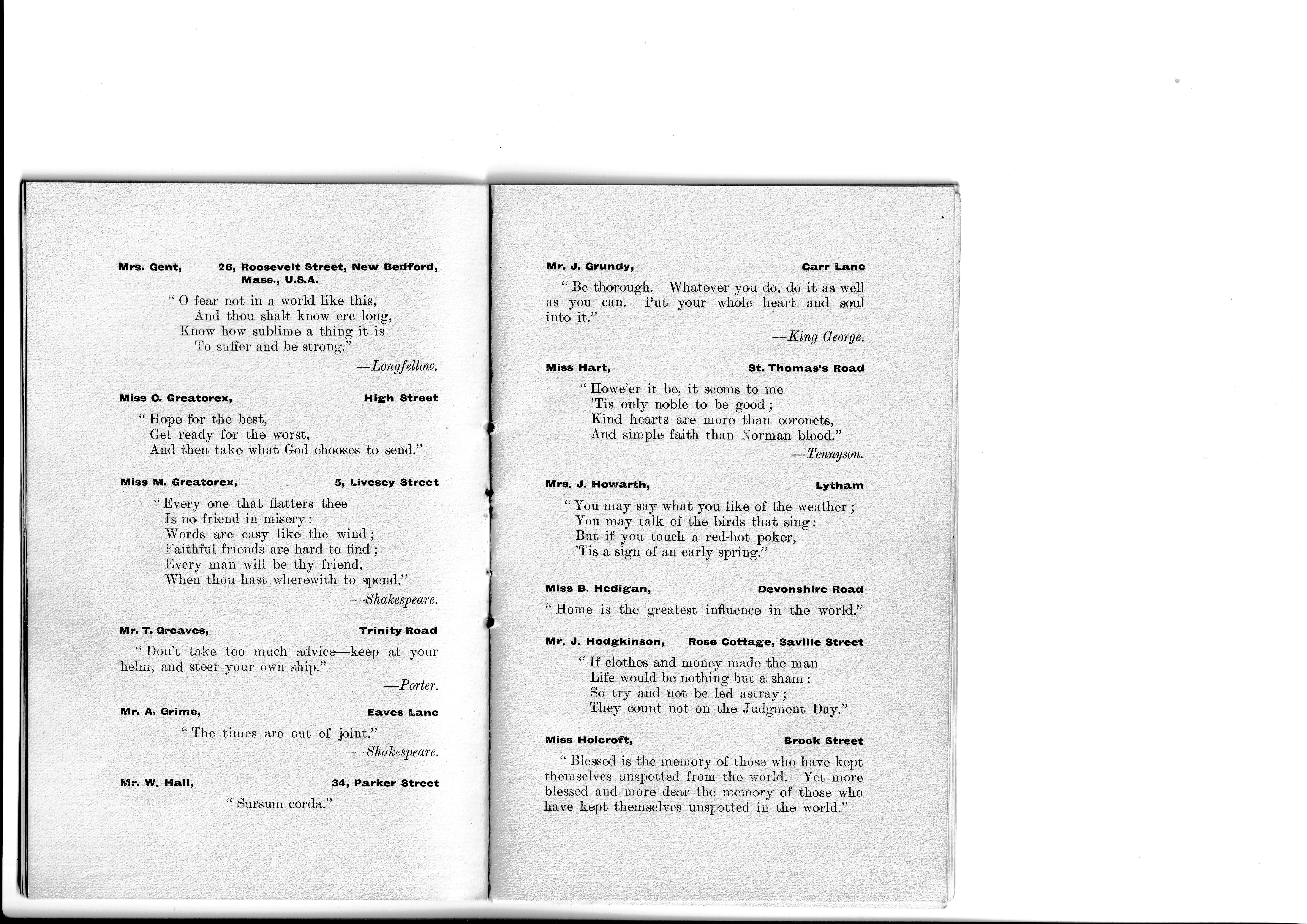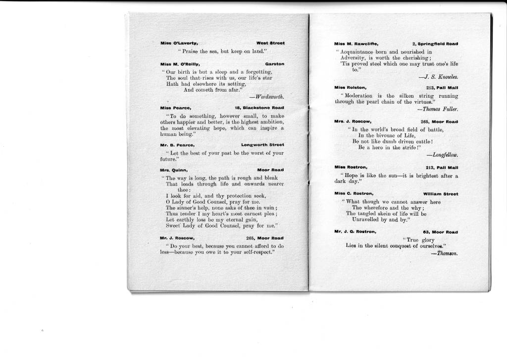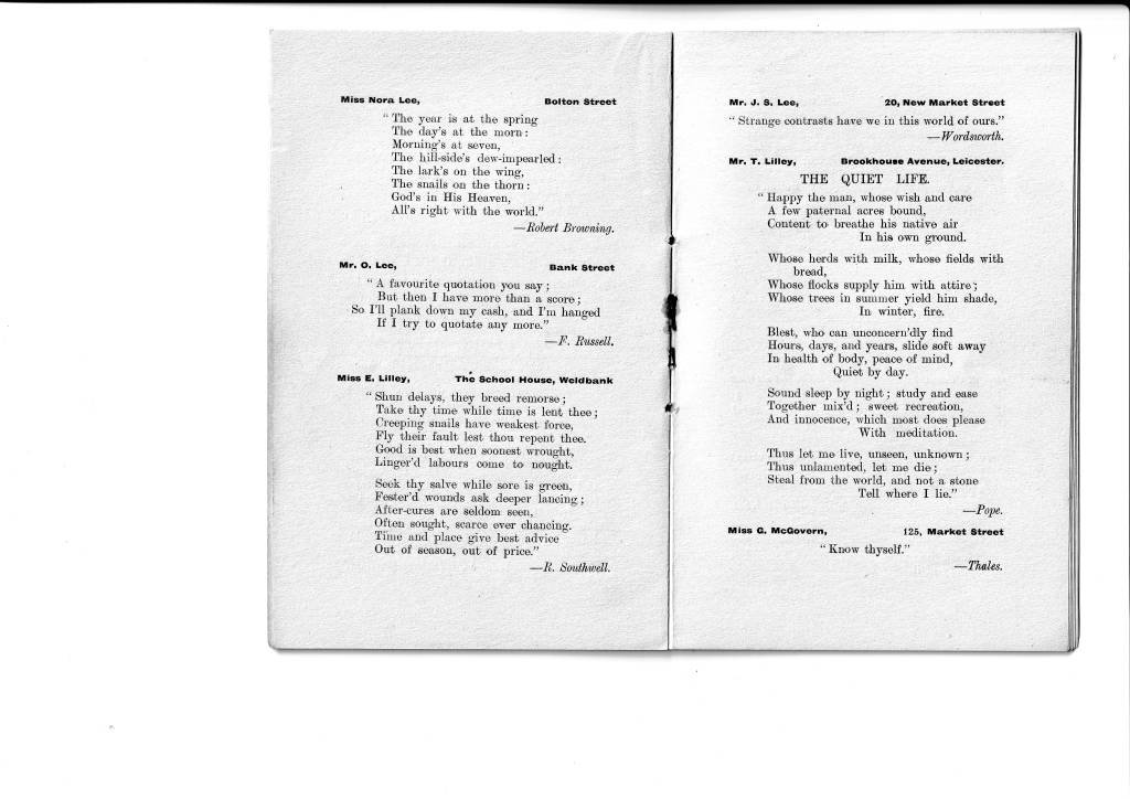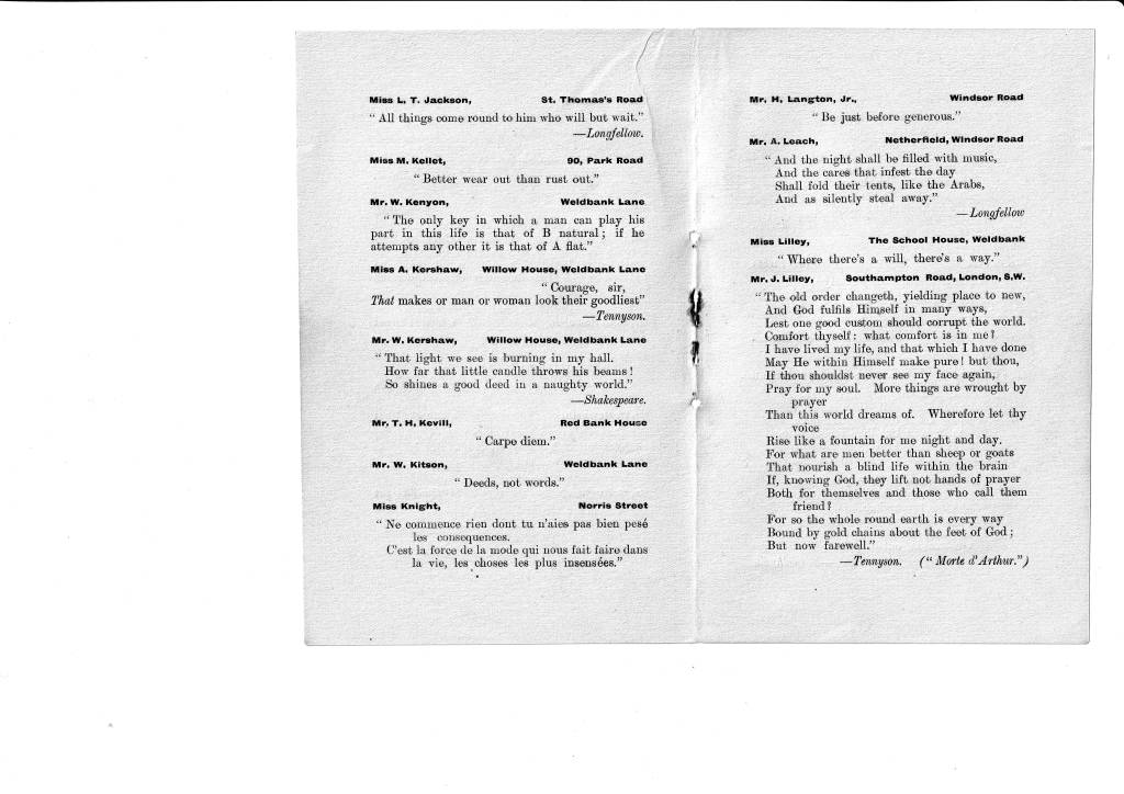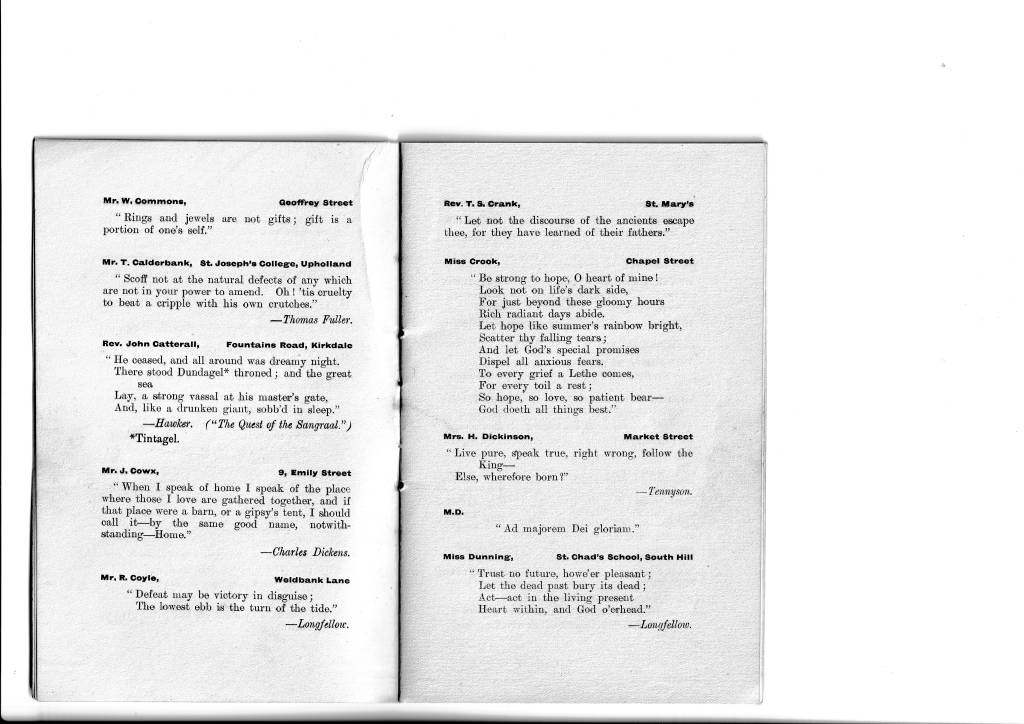 I think we all have a tendency to imagine that our ancestors, especially in a small town such as Chorley, would not have had much access to literature and perhaps we assume that their education was very limited. Certainly it was different from the education of today but literature was an important part of it. (I can recall an aunt of my mother’s, when in her 70s, reciting the entire ‘Rime of the Ancient Mariner’ which she had first learnt at school.) This little book indicates that the Weldbankers of old were indeed not the country yokels one might imagine. Their names and even addresses are given and, if your ancestors were Chorley folk at the turn of the last century, you might come across one of them here, sharing their favourite quotation. I certainly did; my grandmother, one of seventeen children and working as a weaver in a cotton mill, has submitted a quote about friendship. As her mother had died when she was only six years old and her stepmother was rather unkind to the children of her husband’s first wife, I imagine that friendship was something she valued highly.