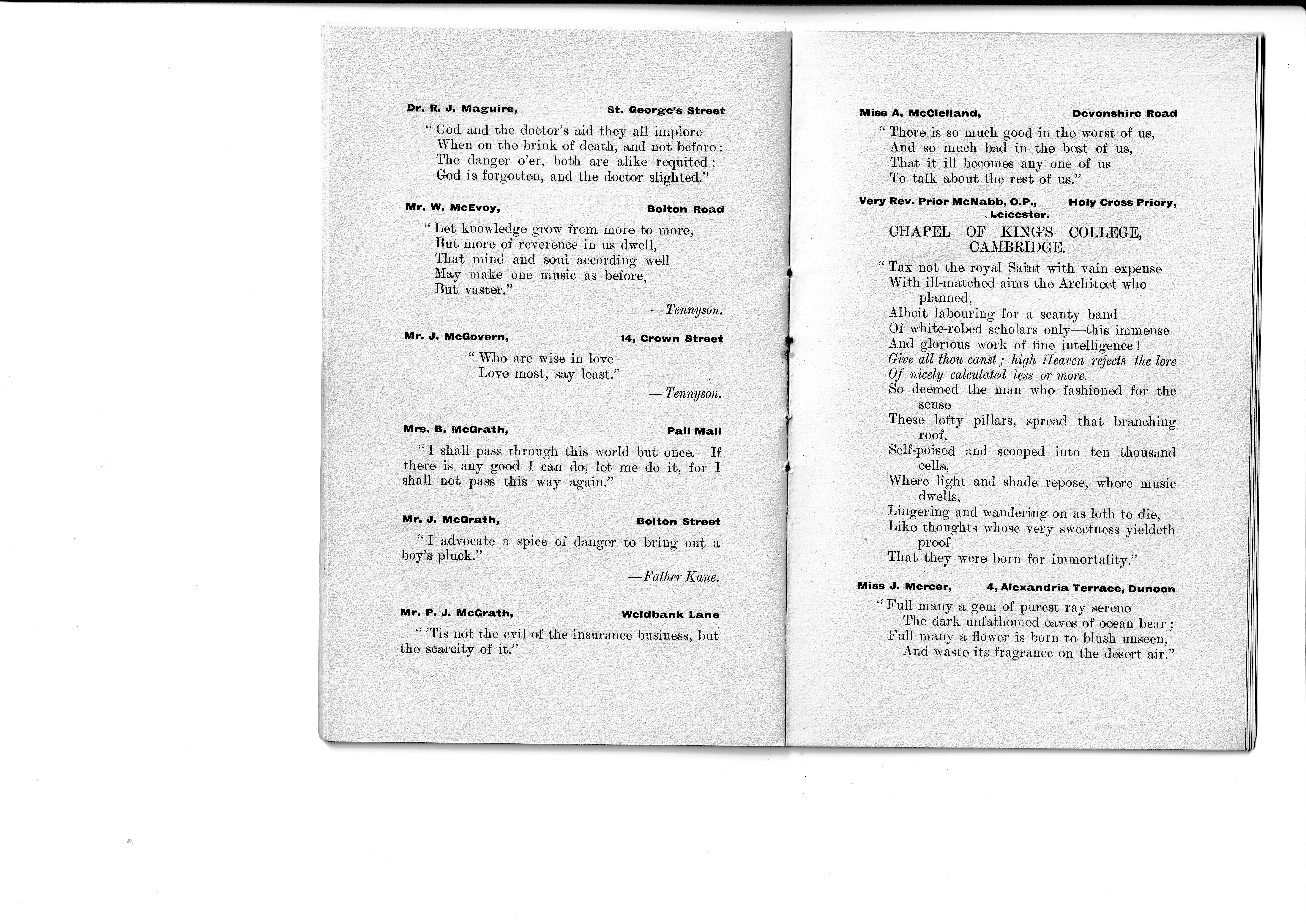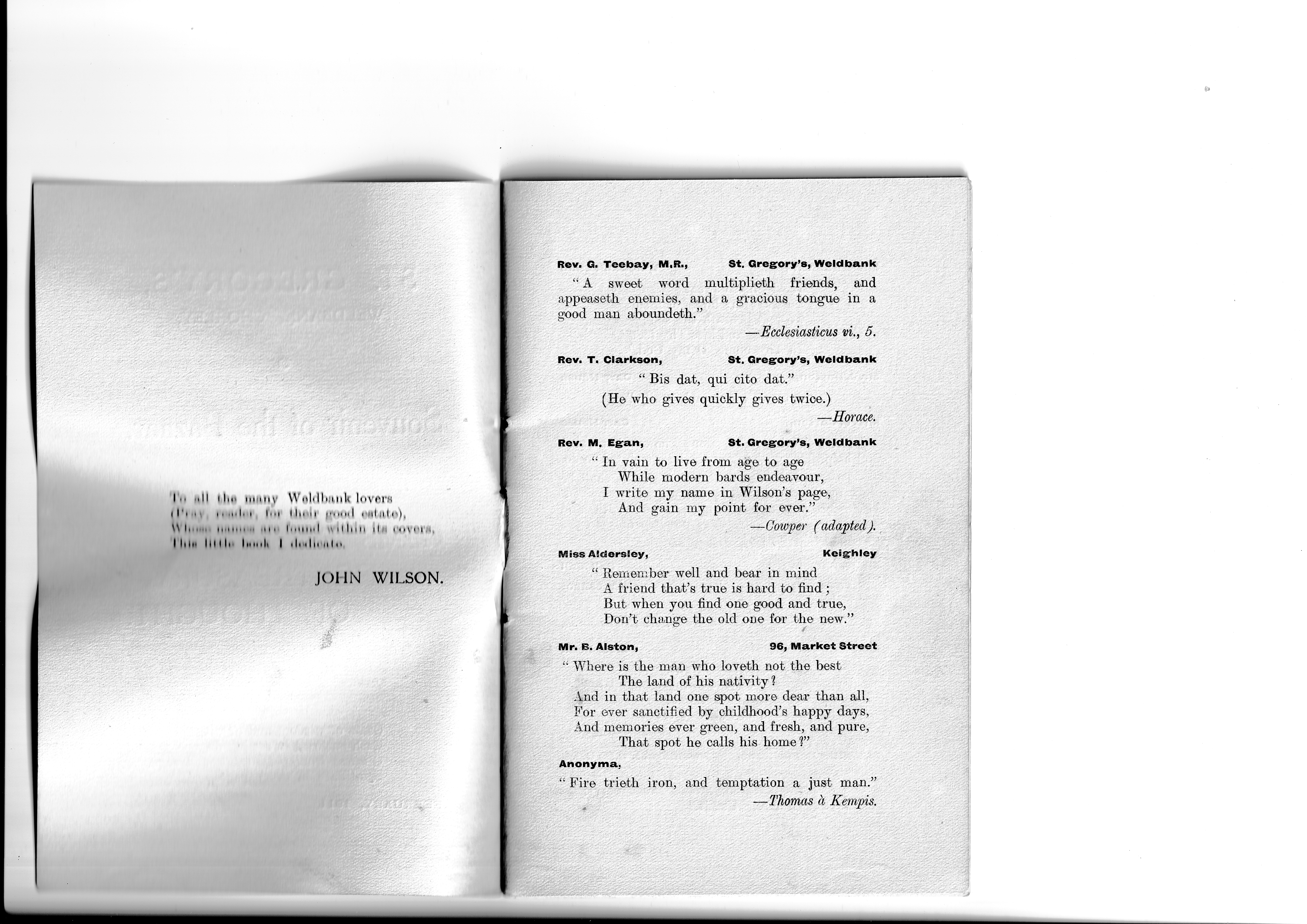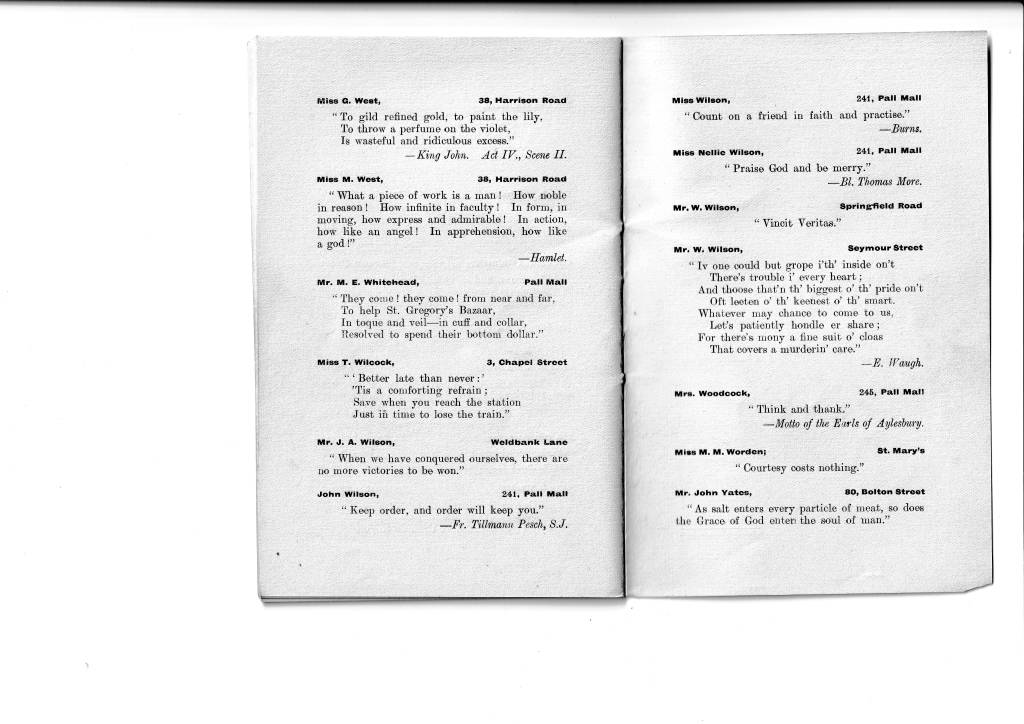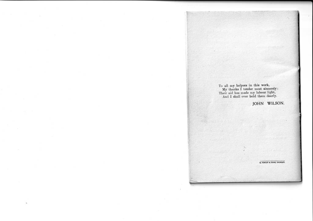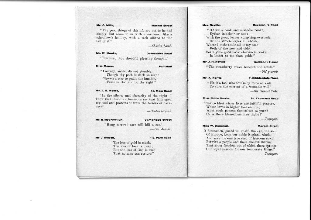 This little book came to light only this week (July 2024) having been rescued from a house clearance. As stated on page 1, it is a souvenir of a bazaar that was held in 1911 or perhaps in late 1910. I rather think that it would have been printed and sold for a few pence in order to raise money for church funds. Tom Gillett mentions a bazaar held in the 1890s and we also have photos of one held in 1906 when it appears that the theme was ‘The British Empire’ so this one in 1911 was nothing new. The booklet of quotations was almost certainly the idea of John Wilson, himself a writer of poetry, especially about Chorley, and also writer of the words to the Weld Bank song. He had come to Chorley from his native Pontefract in Yorkshire in 1888 to work Chorley’s postman here. His early letters home, written in verse, indicate that he found our town very much to his liking so he settled here permanently and married a Chorley lass, Sarah Rostron. They lived at 243, Pall Mall and had two daughters, Mary and Helen. Mary Wilson later became a teacher at Weld Bank school and Head of the Infant’s Department. Helen became a milliner and dressmaker and had a shop in town.